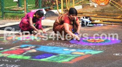 Photo Caption : BBMP workers applying rangoli during the inauguration “Svanidhi Mahotsavâ€, as part of the Azadi Ka Amrit Mahotsav celebration at BBMP Head office, in Bengaluru on Monday 18th July 2022