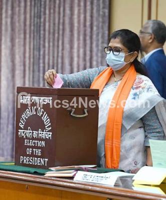 Photo Caption : Minister Shashikala Jolle casting her vote for the election of the President at Vidhana Soudha, in Bengaluru on Monday 18th July 2022