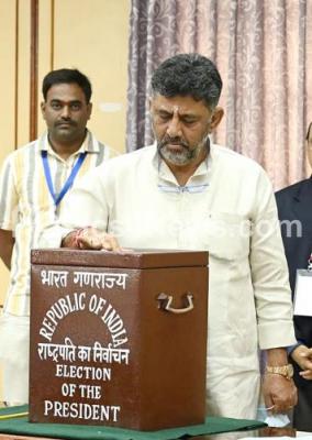 Photo Caption : KPCC President DK Shivakumar casting his vote for the election of the President at Vidhana Soudha, in Bengaluru on Monday 18th July 2022