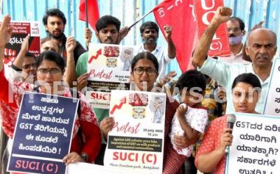 Photo Caption : Members of SUCI (Socialist Unity Centre of India Comunist ) protesting against central government inflation and the decision to increase GST on food items, in Bengaluru on Wednesday 20th July 2022