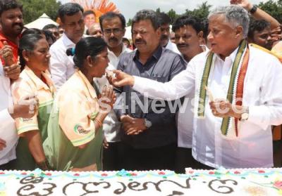 Photo Caption : Minister V Somanna celebrated his birthday with BBMP Pourakarmika workers at Govindaraj Nagar, in Bengaluru on Wednesday 20th July 2022