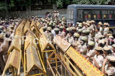 Photo Caption : Police security during congress party protest rally in support of the AICC President Sonia Gandhi, who appeared before the ED (Enforcement Directorate) in connection with the National Herald case, in Bengaluru on Thursday 21st July 2022