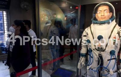 Photo Caption : Indian space enthusiasts and students look at the space equipment models at the Human Space Flight Expo organised by the Indian Space Research Organisation (ISRO) at the Jawaharlal Nehru Planetarium, in Bengaluru on Friday 22nd July 2022