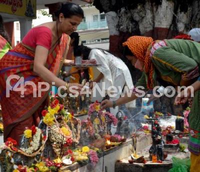 Devotees pouring milk to perform pooja at Naga statue on the occasion of Nagara Panchami at a temple, in Bengaluru Tuesday 2nd August 2022