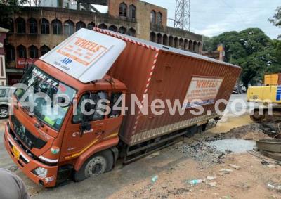 Photo Caption : A truck got stuck in a under repair road due to last night rains at JC Road, in Bengaluru Wednesday 3rd August 2022