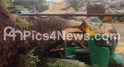 Photo Caption : A huge tree uprooted on a Auto Rickshaw at Chamarajpet due to last night rains at JC Road, in Bengaluru Wednesday 3rd August 2022