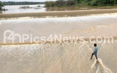 People catching fish at overflowing Bheemanakuppe lake which was overflowing after heavy rain in the region, in Bengaluru Thursday 4th August 2022