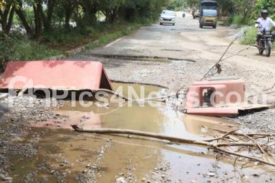 Photo Caption : Bad road conditions and pothole roads has been causing major inconvenience to people and motorists at 100 feet road, Vishweshwaraya Layout, in Bengaluru Saturday 6th August 2022