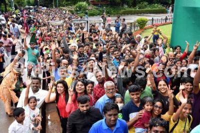 Crowd at the 75th India Independence Day Flower Show at the Glass House in Lalbagh Botanical Gardens, and the theme of the flower show is based on Kannada film stars Dr Rajkumar and his son Puneeth Rajkumar, in Bengaluru Sunday 7th August 2022