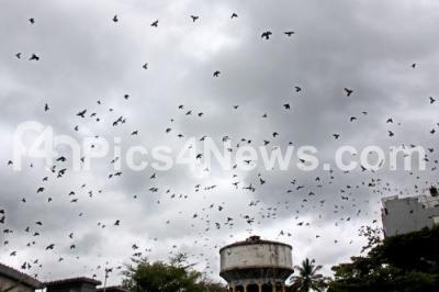 Flock of pigeons take a flight near Majestic Bus Stand as dark clouds hover over Bengaluru City on Monday 8th August 2022