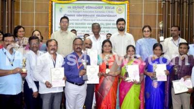 Photo Caption : Minister MTB Nagaraju with Rakesh Singh, Additional Chief Secretary Urban Development Department, Dr. Ajay Nagabhushan, Secretary Urban Development Department and CMAK awardees during CMAK Institute Release of documentation of best practices and award presentation program at Vikasa Soudha organized by City Managers Association, Karnataka, in Bengaluru on Thursday 11th August 2022