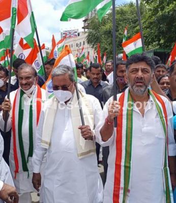 CLP Leader and Former CM Siddaramaiah with KPCC President DK Shivaumar, Congress leader KJ George and Congress workers during Tiranga Rally as part of 75th Independence Day at Sarvagna Nagar, in Bengaluru on Thursday 11th August 2022