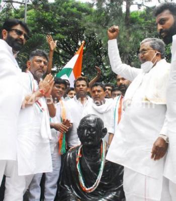 Photo Caption : Former CM and CLP Leader Siddaramaiah with KPCC President DK Shivakumar, Congress leaders BV Srinivas, NA Haris, Mohammed Nalapad and others garlanding the statue of Mahatma Gandhi during their Tiranga Yatra program at MG Road, in Bengaluru on Sunday 14th August 202