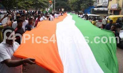 Photo Caption : People take part in a procession carrying a giant Indian national flag on the occasion of 75th Independence Day celebration at Chamarajpet, in Bengaluru on Monday 15th August 2022