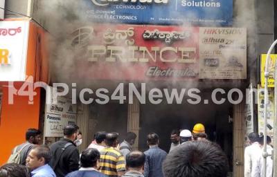 Photo Caption : Fire department in action dose off the fire at Prince electronics shop at SP Road, in Bengaluru on Thursday 18th August 2022