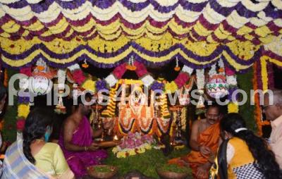 Photo Caption : Devotees offering pooja at Sri Govardhana Kshetra Temple, on the occasion of Sri Krishna Janmashtami, in Bengaluru on Friday 19th August 2022