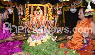 Photo Caption : Priests performing Mahamangalarati to lord Sri Krishna at Sri Govardhana Kshetra Temple, on the occasion of Sri Krishna Janmashtami, in Bengaluru on Friday 19th August 2022