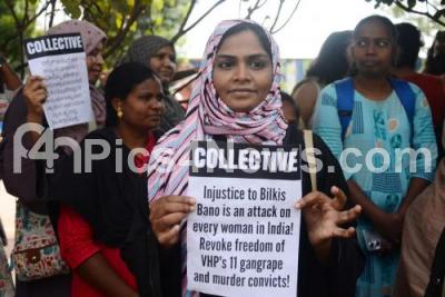 Photo Caption : Members of Various organisations protest against the release of 11 convicts involved in Bilkis Bano rape and Murder case at freedom Park, in Bengaluru on Monday 22nd August 2022