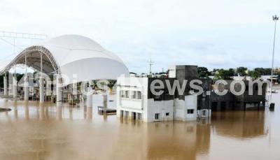 The Mysore Road Highway Toll Gate and offices have been flooded due to the overflowing of the Seshagirihalli lake next to the Mysore Road Highway due to last night heavy rain, the newly built toll gate and offices which are unscientifically built under the lake embankment, in Bengaluru on Saturday 27th Aug 2022