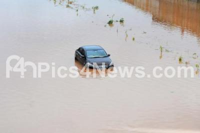 Photo Caption : A car which was stuck in the flooded water at Mysuru Road Highway at Basavanapura Village, Ramanagar District after heavy rain fall in the early hours, in Ramanagar on Monday 29th Aug 2022