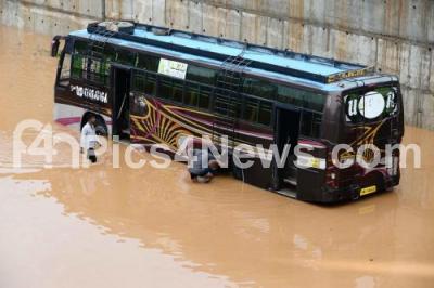 Photo Caption : A bus which was stuck in the flooded water at Mysuru Road Highway at Basavanapura Village, Ramanagar District after heavy rain fall in the early hours, in Ramanagar on Monday 29th Aug 2022