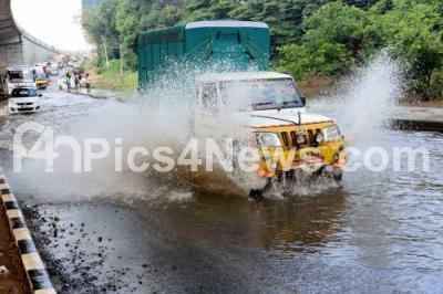 Photo Caption : Vehicles wade through flooded Mysuru Road highway near Kumblagodu, after Hosapalya (Kanminike kere) lake adjacent to Mysuru Road highway was overflowing due to overnight heavy rainfall, in Bengaluru on Tuesday 30th Aug 2022