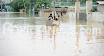 Photo Caption : People using broken refrigerator to transport people through floods at KK Garden near Bellandur, which is flooded with rain water as rains continue to lash Bengaluru City on Tuesday 6th September 2022