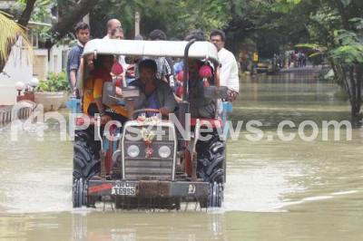 Photo Caption : Residents and Employees using tractor vehicle to reach to their workplace and destinations at Sarjapura, following rain water logged roads due to heavy rainfall in the city, in Bengaluru on Friday 7th September 2022