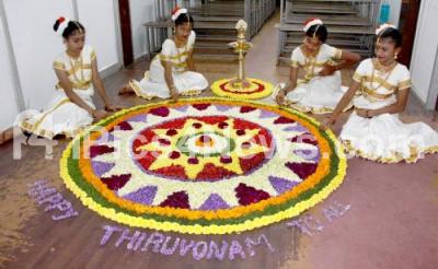 Students drawing at Pookalam, at Little Flower School, Flower Rangoli decorations on the occasion of Onam Festival, in Bengaluru on Thursday 8th September 2022