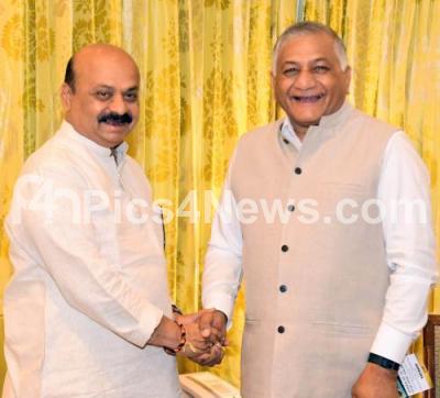 Photo Caption : Union MoS for Road Transport and Highways General VK Singh with Chief Minister of Karnataka Basavaraj Bommai during a meeting, in Bengaluru on Friday 9th September 2022