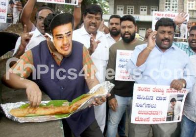 Photo Caption : Members of Bengaluru City Youth Congress protesting against BJP MP Tejasvi Surya with Masala Dosa for not responding to rain water floods, in Bengaluru on Saturday 10th September 2022