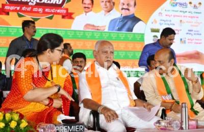 Smriti Irani, Union Minister of Women with Former CM BS Yediyurappa and Chief Minister of Karnataka Basavaraj Bommai during BJP Jana Spandana program to celebrate Chief Minister of Karnataka Basavaraj Bommai government completing one year at Doddaballapur, in Doddaballapur on Saturday 10th September 2022