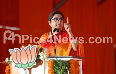 Photo Caption : Smriti Irani, Union Minister of Women addressing during BJP Jana Spandana program to celebrate Chief Minister of Karnataka Basavaraj Bommai government completing one year at Doddaballapur, in Doddaballapur on Saturday 10th September 2022