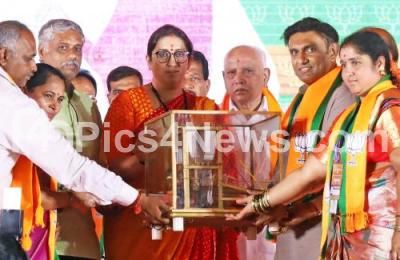 Photo Caption : Smriti Irani, Union Minister of Women being felicitated during BJP Jana Spandana program to celebrate Chief Minister of Karnataka Basavaraj Bommai government completing one year at Doddaballapur, in Doddaballapur on Saturday 10th September 2022