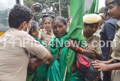 Photo Caption : Police personnel detain farmers as they protest to press for legal for MSP and other demands, at City Railway station, in Bengaluru on Monday 12th September 2022