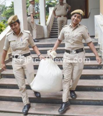 Photo Caption : Police personnel carrying seized drugs, ganja oil during a press conference at Police Commissioner Office, in Bengaluru on Tuesday 13th September 2022