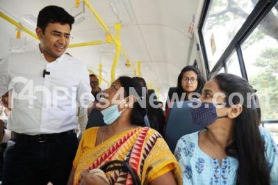 Event Description : Bengaluru South MP Tejasvi Surya takes the bus from Silk Board and hears commuters feedback regarding electric buses, in Bengaluru on Tuesday 13th September 2022