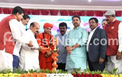 Photo Caption : Chief Minister of Karnataka Basavaraj Bommai with Seer Sri Immadi Siddarameshwara, Minister R Ashoka, MLAs S Raghu, Akhanda Srinivas and others during Suvarna Mahotsava celebrations of Karnataka Bhovi Welfare Association, in Bengaluru on Sunday 18th September 2022