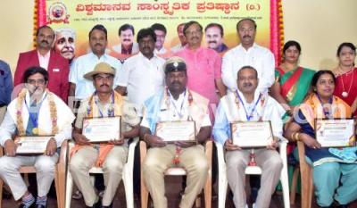 Photo Caption : A H Basavaraju, EX-Councilor and President Sri Banashankari Temple presenting "Vishwamanava Achievement" award to achievers from various field during inauguration of 10th anniversary of Vishwamanava Cultural Foundation at Gandhi Bhavan, also seen are Dr. RK Nallor Prasad, Former President, Kannada Sahitya Parishat and others , in Bengaluru on Sunday 18th September 2022