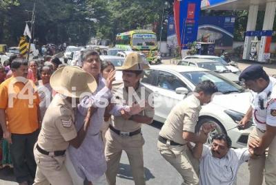 Photo Caption : Police detain Congress party workers during a protest against the fake bills of crore of rupees in civil works in Malleshwaram assembly constituency, in Bengaluru on Friday 23rd September 2022