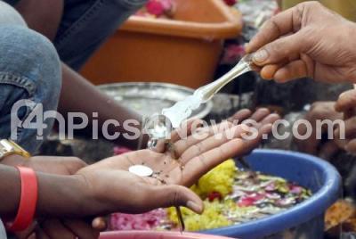 Devotees perform rituals to departed souls on the occasion of Final day of Pitru Paksha Mahalaya Amavasya at Kashi Vishwanath Temple, in Bengaluru on Sunday 25th September 2022