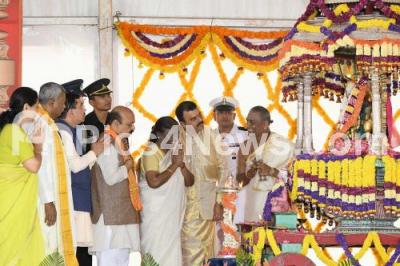 Event Description : President Droupadi Murmu inaugurating the Mysuru Dasara Festival by offering flowers to Goddess Chamundeshwarai, Chamundi Hills, also seen are Chief Minister of Karnataka Basavaraj Bommai, Governor of Karnataka Thaawar Chand Gehlot and others, in Mysuru on Monday 26th September 2022
