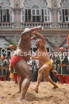 Photo Caption : “Vajramushti Kalaga†(wrestlers) participants in action as part of the Vijayadashami celebrations, at Mysuru Palace premises, in Mysuru on Wednesday 5th October 2022