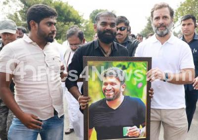 Photo Caption : People presenting Actor Puneeth Rajkumar portrait to Congress leader Rahul Gandhi during Congress Bharat Jodo Yatra, in Tumkur District on Saturday 8th October 2022
