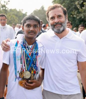 Photo Caption : Congress leader Rahul Gandhi with young athlete during Congress Bharat Jodo Yatra, in Tumkur District on Saturday 8th October 2022