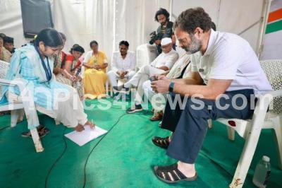 Photo Caption : A physically challenged woman writing with her toes in front of Congress leader Rahul Gandhi during Congress Bharat Jodo Yatra, in Chitradurga District on Tuesday 11th October 2022