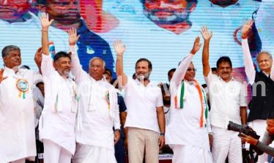 Photo Caption : Congress leader Rahul Gandhi with Congress leaders Mallikarjuna Kharge, Siddaramaiah, KPCC President DK Shivakumar, Venugopal and others during Congress Bharat Jodo Yatra, in Bellary district on Saturday 15th October 2022