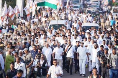 Photo Caption : Congress leader Rahul Gandhi with Congress leaders Mallikarjuna Kharge, Siddaramaiah, KPCC President DK Shivakumar, KC Venugopal and others during Congress Bharat Jodo Yatra, in Bellary district on Saturday 15th October 2022