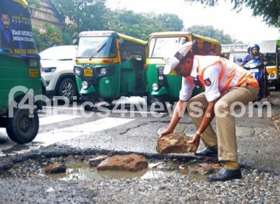Photo Caption : Traffic police personnel filling pothole with stone at MG Road , in Bengaluru on Sunday 16th October 2022