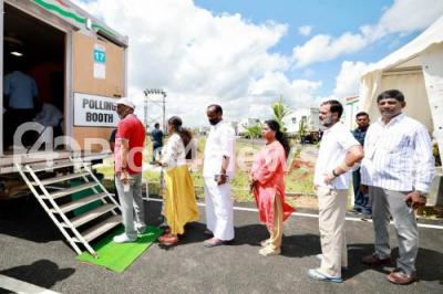 Photo Caption : Congress leader Rahul Gandhi and congress leaders standing in the line to cast their vote for the AICC President election, at Sanganakallu, in Bellary District on Monday 17th October 2022